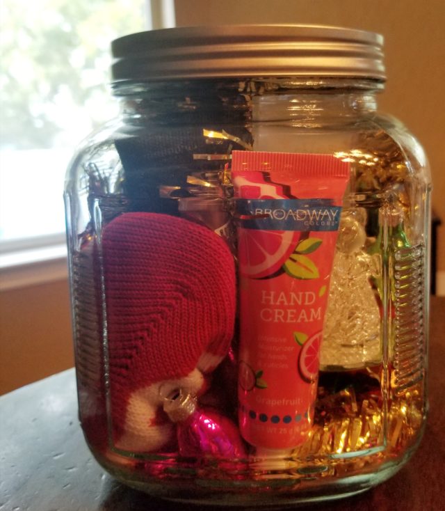 - Assorted treats that are small enough to fit in the jar: Candy, nuts, socks, ties, ornaments, nail polish, lipstick, teabags, mini candles, etc.